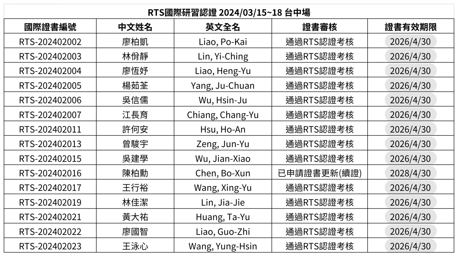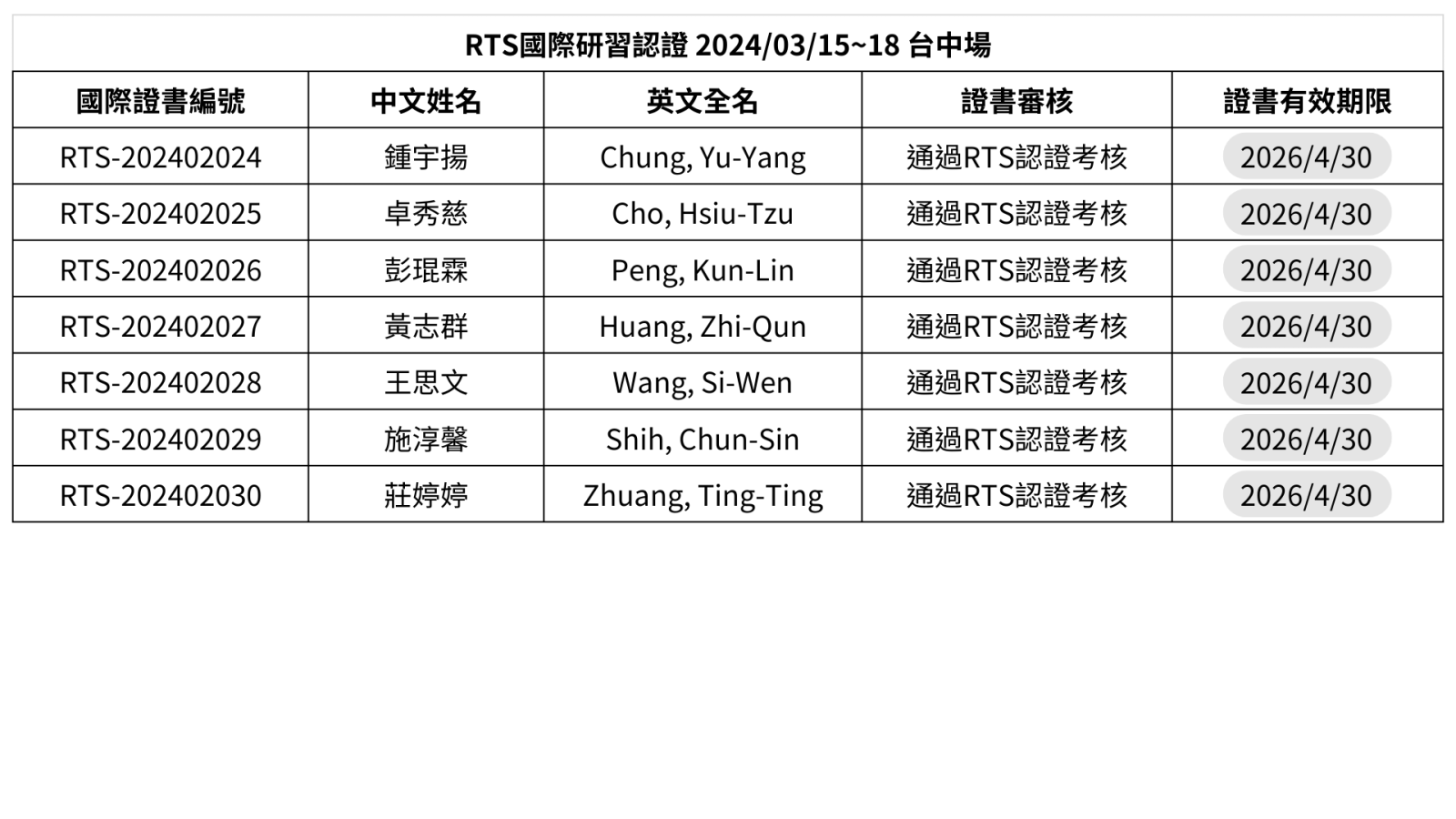 RTS國際研習認證通過名單『2024/03/15~18台中場』