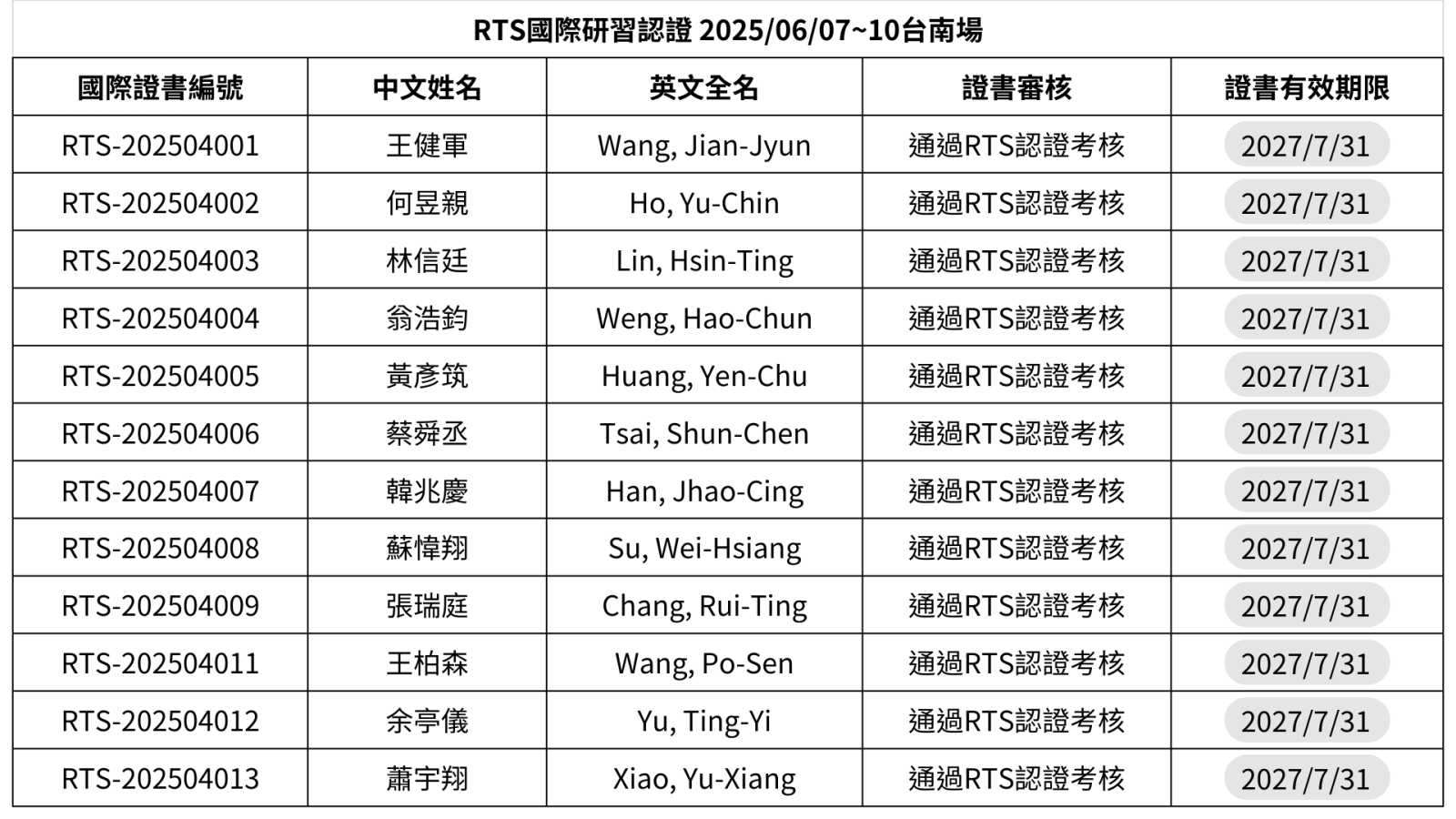 RTS國際研習認證通過名單『2025/06/07~10台南場』