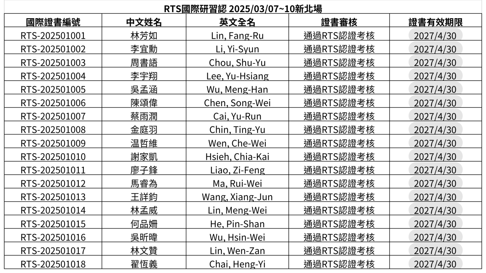 RTS國際研習認證通過名單『2025/03/07~10新北場』