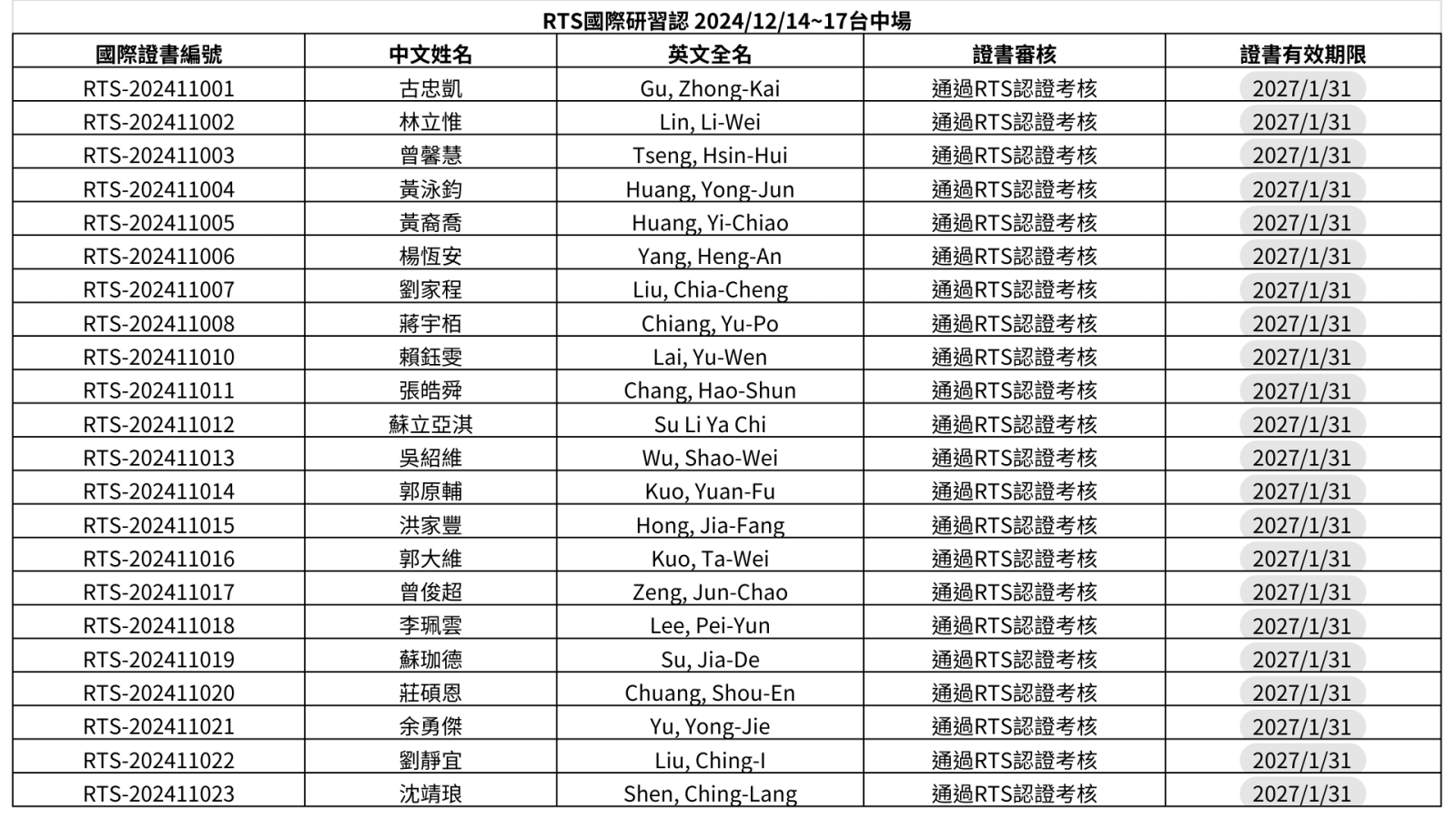 RTS國際研習認證通過名單『2024/12/14~17台中場』