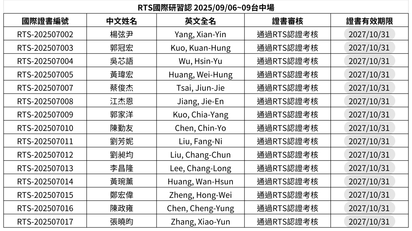RTS國際研習認證通過名單『2025/09/06~09台中場』