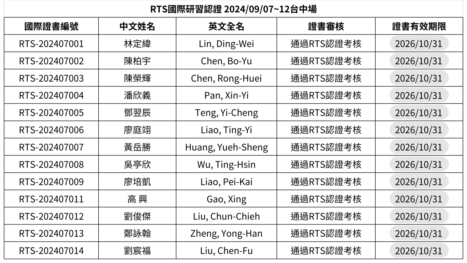 RTS國際研習認證通過名單『2024/09/07~10台中場』